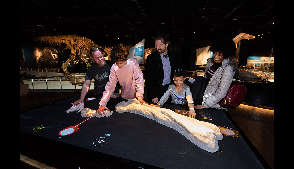Visitors to T. rex: The Ultimate Predator will encounter a massive life-sized model of a T. rex with patches of feathers — the definitive representation of this prehistoric predator. The exhibition will also include reconstructions of several T. rex hatchlings and a four-year-old juvenile T. rex. Interactives include a “roar mixer” where visitors can imagine what T. rex may have sounded like by blending sounds from other animals; a shadow theater featuring a floor projection of an adult T. rex skeleton coming to life; and a life-sized animation of T. rex in a Cretaceous environment that responds to visitors’ movements. At a tabletop “Investigation Station,” visitors can explore a variety of fossil casts ranging from coprolites (fossilized feces) to a gigantic femur, with virtual tools including a CT scanner, measuring tape, and a microscope to learn more about what such specimens can reveal to scientists about the biology and behavior of T. rex.